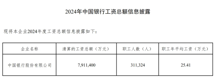 具体来看,2024年度,中行清算的工资总额791.14亿元,职工年平均工资25.41万元,同比增长2.3%。